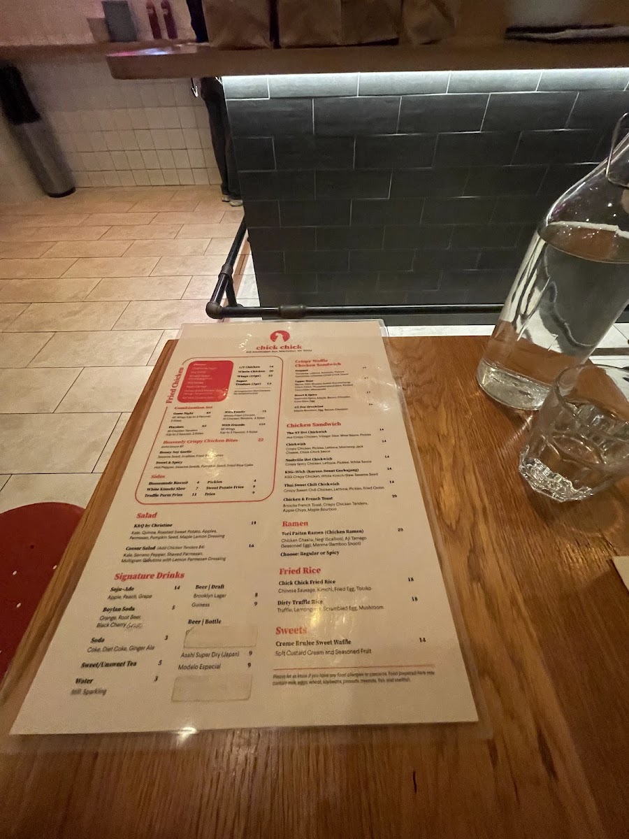 Korean sweet gochujang crispy chicken, white kimchi slaw, sesame seed. (peanut in sauce)